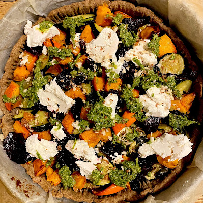 To odkrycie to prosta, lekka, doskonała kolacja. Na kruchym spodzie upieczonym, który robię z bezglutenowej mąki gryczanej albo owsianej, układam wcześniej upieczone warzywa, u mnie dzisiaj to cukinia, dynia i burak. Przygotowuję pesto. Całość podgrzewam tuż przed podaniem, polewam oliwą i pesto, posypuję orzechami albo migdałami siekanymi, czasami, chociaż rzadko, bo wtedy tarta przestaje być wegańska, dodaję serek kozi, jak dzisiaj. Wystarczy, że pominiecie dodanie serka koziego czy jakiegokolwiek innego sera, a tarta będzie całkowicie wegańska i bezglutenowa. Pesto jest wegańskie, robię je bez sera.